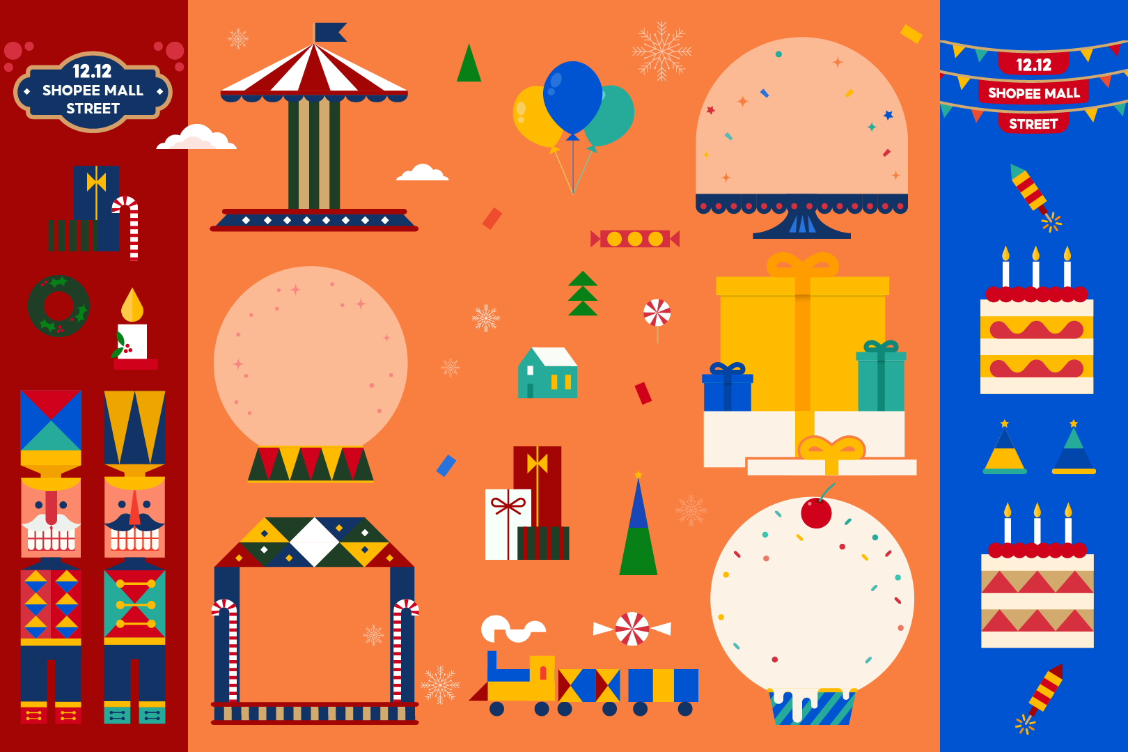 Created a series of illustrations for an in-app landing page for Shopee 12.12. Birthday Sale. The festive theme varies for different countries depending on their campaign.